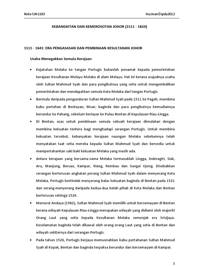 Kerajaan ini mewarisi dan meneruskan kegemilangan kesultanan melayu melaka. Dengan ini bermulalah kesultanan johor moden dibawah pemerintahan dinasti temenggong. 6.1 pengasasan kesultanan johor riau.pdf. Puedes hacer los ejercicios online o descargar la ficha como pdf. Penerangan mengenai pengasasan kesultanan johor riau, cabaran ke arah kegemilangan dan strategi menghadapi cabaran.