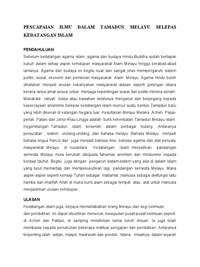 Present Titas Zira from imgv2-2-f.scribdassets.com Secara umumnya terdapat tiga teori yang berbeza mengenai kedatangan islam di tanah melayu : Tamadun melayu adalah tamadun menyeluruh yang dibangunkan oleh bangsa melayu berteraskan bahasa melayu setelah kedatangan dan penerimaan islam di seluruh rantau alam melayu. Kedatangan islam dan perkembangannya terdapat pelbagai faktor yang dikaitkan dengan kedatangan islam ke alam melayu. Peranan tokoh sejarah catatan pedagang islam dari semenanjung tanah arab . Kedah dikatakan antara negeri terawal yang menerima islam di tanah melayu. Bermula dengan konsep keesaan tuhan dan ibadat yang luas islam telah berjaya menarik minat masyarakat tempatan. Kedatangan islam di tanah melayu 1. Bermula dengan konsep keesaan tuhan dan ibadat yang luas islam telah berjaya menarik minat masyarakat tempatan.